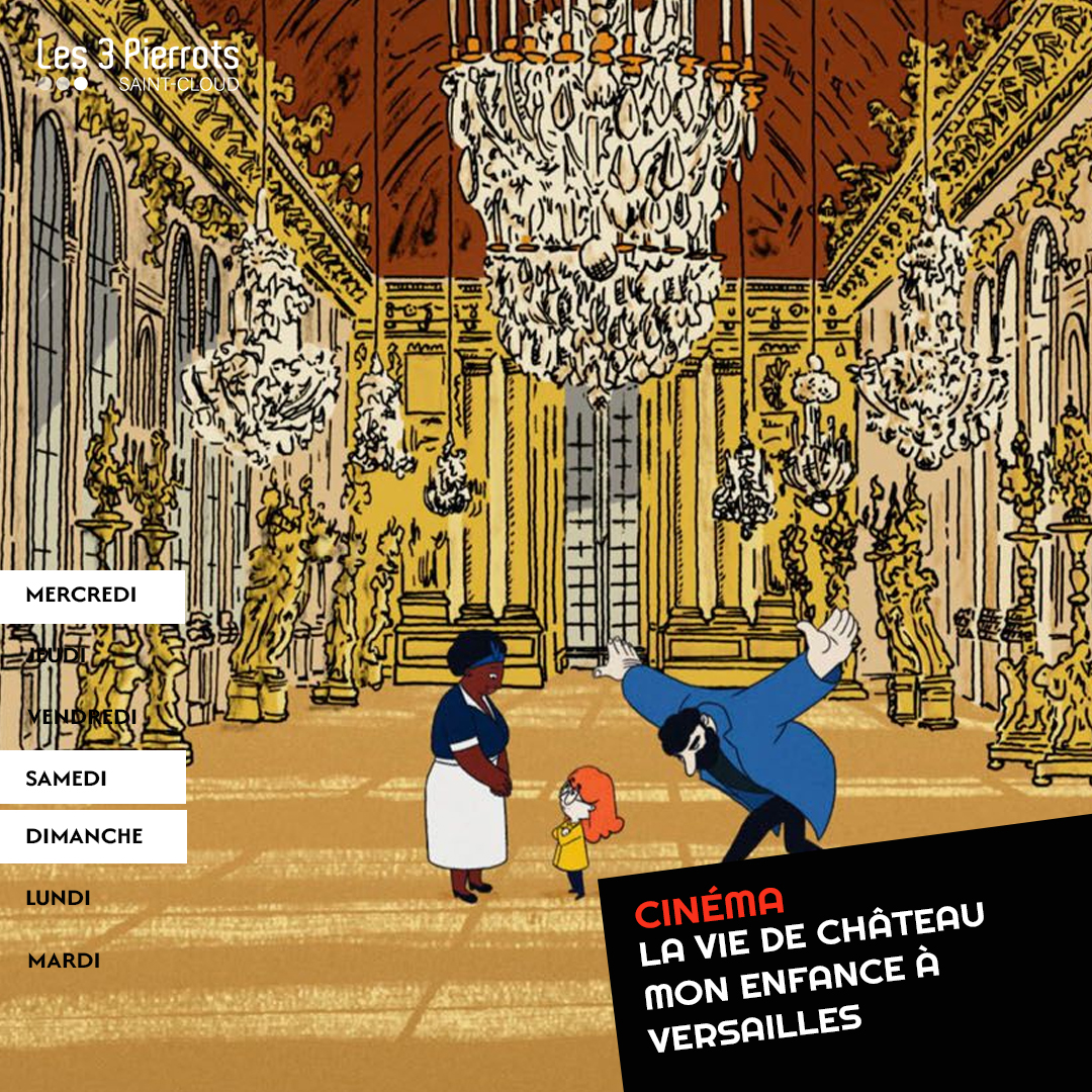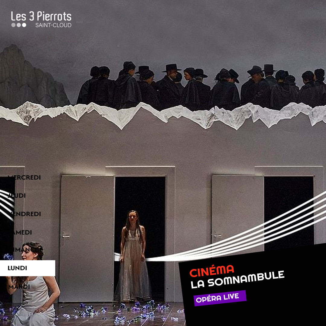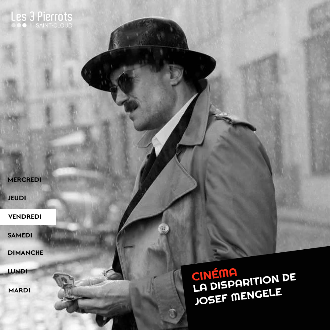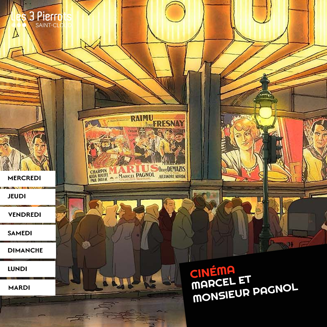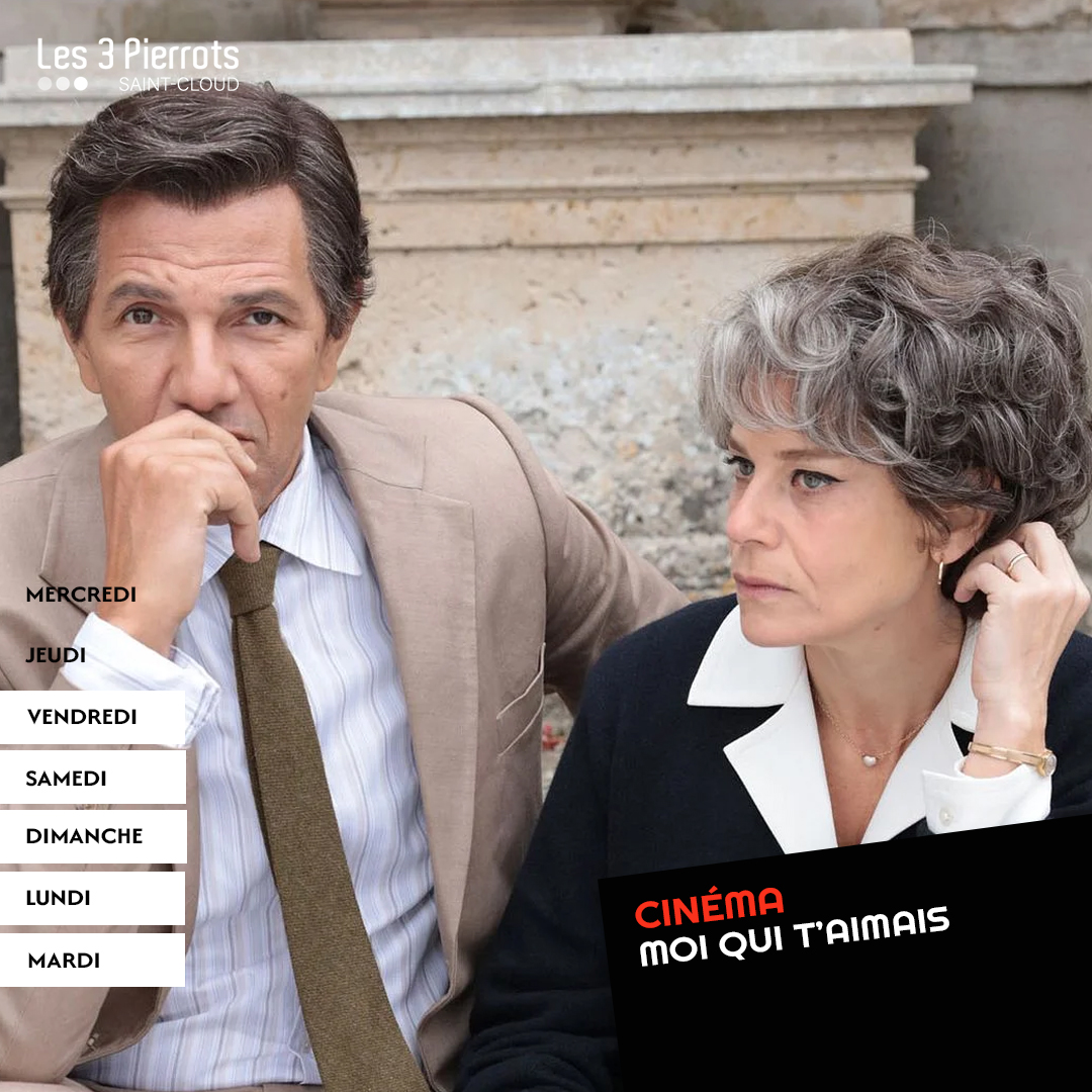 15 oct 21 oct Du Mercredi 15 octobre 2025 au Mardi 21 octobre 2025 Cinéma Les 3 Pierrots LA SOMNAMBULE voÉtats-Unis - 3h15 - OpéraRéalisé par Rolando VillazónAmina et Elvino viennent de se marier. Tout le village est en liesse à l’exception de Lisa.Opéra liveSam : 18h55 CHIEN 51Hors compétition – Mostra de VeniseFrance, Belgique – 1h40 - Science-FictionRéalisé par Cédric JimenezParis est divisé en 3 zones qui séparent les classes sociales et où l’intelligence artificielle a révolutionné le travail de la police.Mer : 16h | Jeu : 14h | Ven : 18h30Sam : 14h, 20h30 | Dim : 14h15, 16h15, 20h30Lun : 14h, 20h45 | Mar : 14h15, 16 MARCEL ET MONSIEUR PAGNOLMer : 20h30 | Jeu : 21hVen : 16h15, 18h15, 20H45Sam : 14h15Dim : 18h15, 21hLun : 14h15, 16h15Mar : 16h15, 20h45 LA DISPARITION DE JOSEF MENGELE voAVANT-PREMIÈRESélection officielle – Festival de CannesAllemagne, France - 2h16 - Biopic, DrameRéalisé par Kirill SerebrennikovJosef Mengele, le médecin nazi du camp d’Auschwitz, parvient à s’enfuir.Ven : 20h30 LA VIE DE CHÂTEAUMON ENFANCE À VERSAILLESÀ partir de 6 ansFrance, Luxembourg - 1h21 - AnimationRéalisé par Clémence Madeleine-Perdrillat, Nathaniel H’limiViolette a 8 ans, du caractère à revendre et un nouveau tuteur !Mer : 14h15 | Sam : 16h15 | Dim : 11h30, 16h30 MOI QUI T’AIMAISFrance – 1h58 - BiopicRéalisé par Diane KurysSimone Signoret et Yves Montand étaient le couple le plus célèbre de leur temps.Ven : 16h | Sam : 18h | Dim : 11h15, 14h, 18h30Lun : 16h, 20h30 | Mar : 14h, 20h30 Tous les spectacles