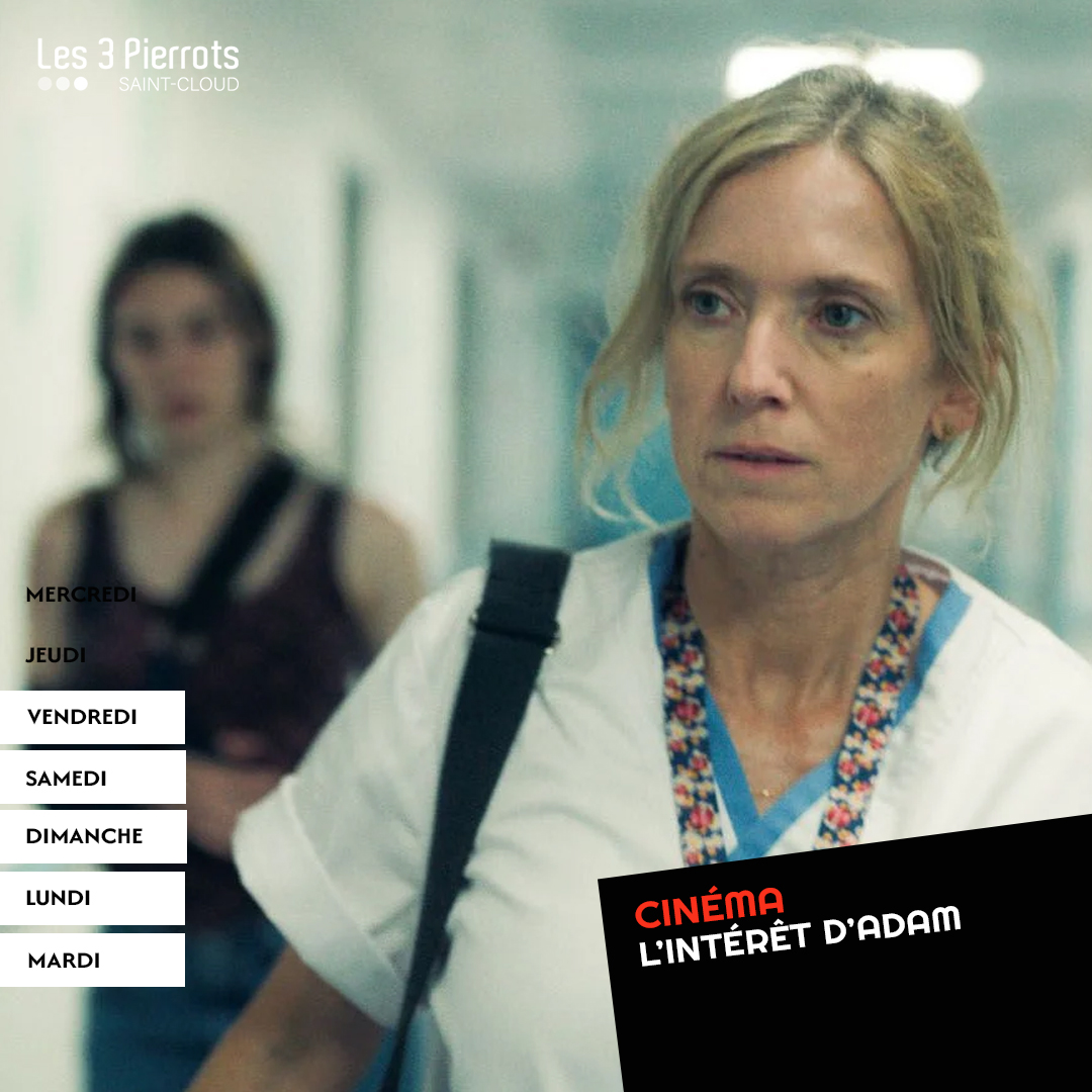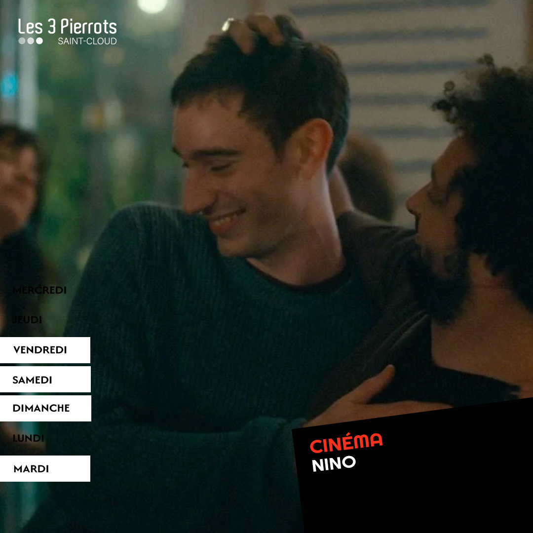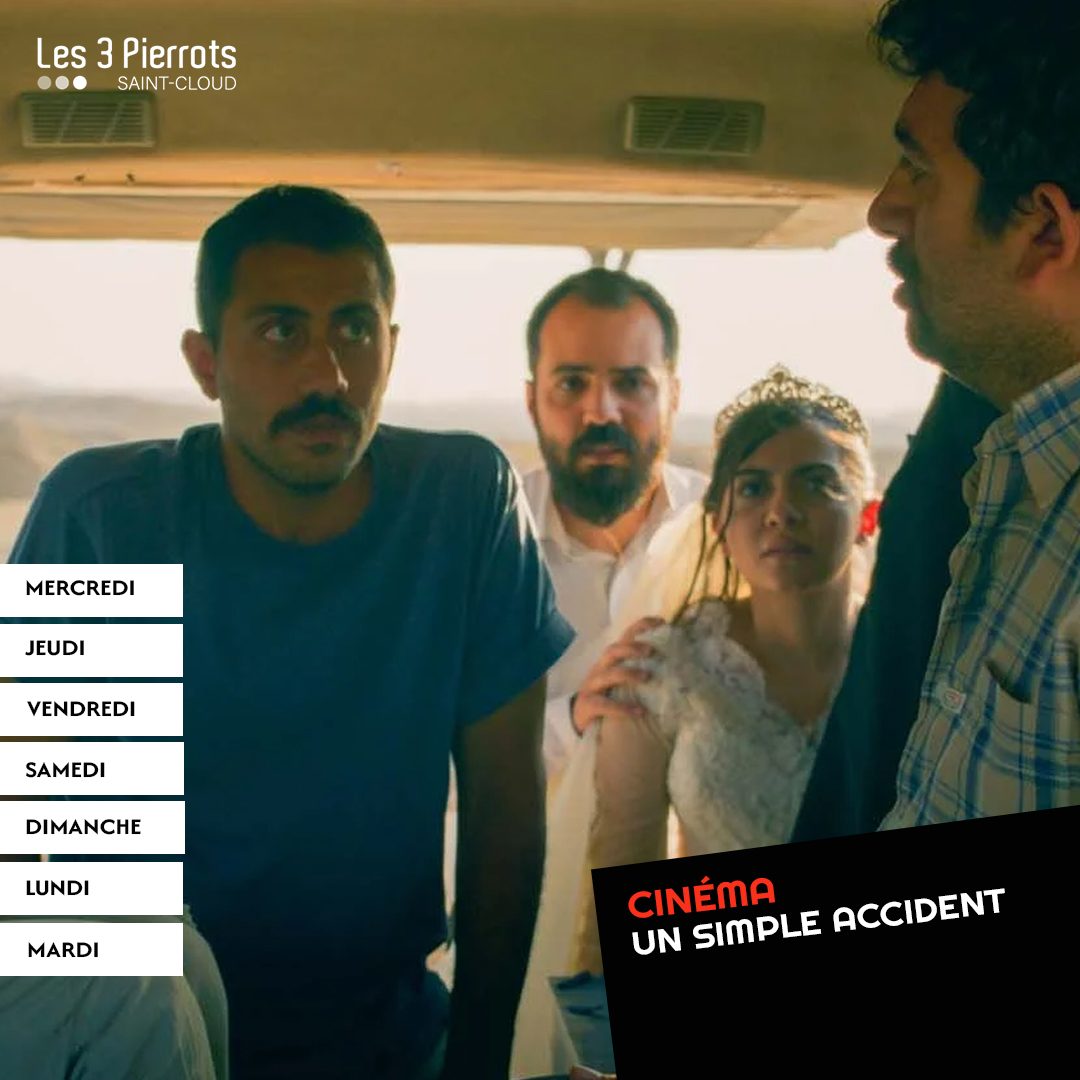 01 oct 07 oct Du Mercredi 1 octobre 2025 au Mardi 7 octobre 2025 Cinéma Les 3 Pierrots UN SIMPLE ACCIDENT voPalme d’Or - Festival de CannesFrance, Luxembourg, Iran – 1h42 - DrameRéalisé par Jafar PanahiIran, un homme croise par hasard celui qu’il croit être son ancien tortionnaire.Mer : 20h30 | Jeu : 21h | Ven : 16h, 20h30Sam : 16h, 20h30 | Dim : 14h, 16h15, 20h45Lun : 16h15, 20h30 | Mar : 20h30CLASSE MOYENNEFrance, Belgique – 1h35 - ComédieRéalisé par Antony CordierMehdi a prévu de passer un été tranquille chez ses beaux-parents, mais tout s’envenime...Mer : 16h | Ven : 18h15, 20h45 | Sam : 14h, 20h45Dim : 14h15, 18h30 | Lun : 14h, 16h | Mar : 14h15 L’INTÉRÊT D’ADAMFilm d’ouverture – Semaine de la CritiqueBelgique, France - 1h18 - DrameRéalisé par Laura WandelFace à la détresse d’une jeune mère, une infirmière met tout en œuvre pour l’aider.Ven : 16h15 | Sam : 18h15 | Dim : 16h30, 20h30Lun : 14h15 | Dim : 16h, 20h45 NINOPrix - Semaine de la CritiqueFrance - 1h36 - DrameRéalisé par Pauline LoquèsDans trois jours, Nino devra affronter une grande épreuve.Ven : 18h | Sam : 14h15, 18h | Dim : 11h15, 18h15Mar : 14h, 16h30 CHAMBOULTOUT Dans le cadre de la JOURNÉE DES AIDANTSFrance - 1h40 - Comédie, DrameRéalisé par Éric LavaineBéatrice célèbre la sortie de son livre, dans lequel elle raconte l’accident de son mari qui a bouleversé leur vie.Lun : 20h** Séance en sme : sous-titres sourds et malentendants TIMIOCHEÀ partir de 3 ans, vfGrande-Bretagne, Russie, Allemagne41 min - Animation, FamilleRéalisé par Alex Bain, Andy MartinLe petit poisson qui racontait des histoires…Mer : 14h | Sam : 16h15 | Dim : 11h30 Tous les spectacles